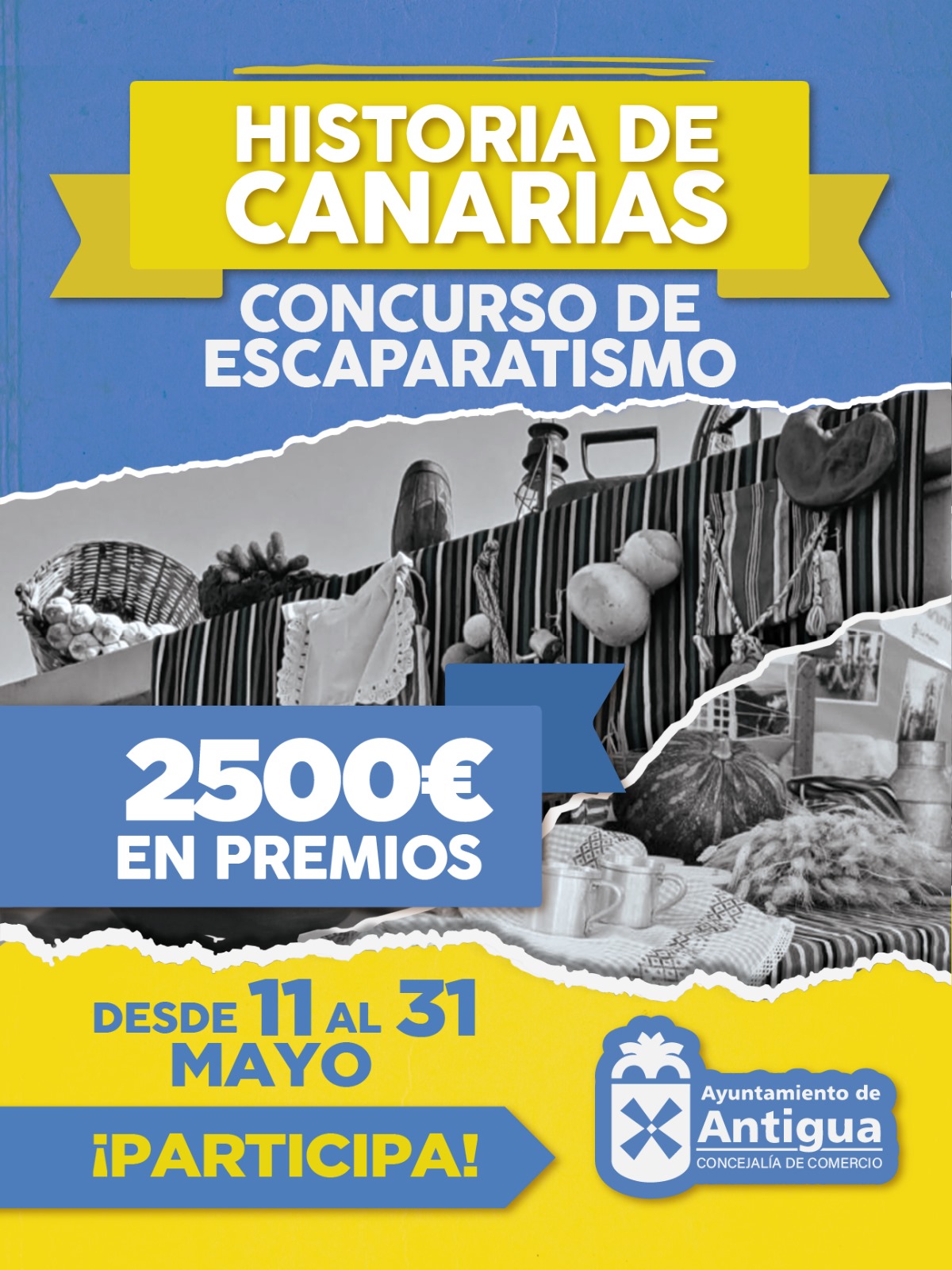 El Ayuntamiento de Antigua desde la concejalía de Comercio organiza hasta el 30 de mayo el Concurso de Escaparatismo y Decoración de interiores con el tema Historia de Canarias, ofreciendo 2.500 euros en premios a los establecimientos participantes del Municipio.
