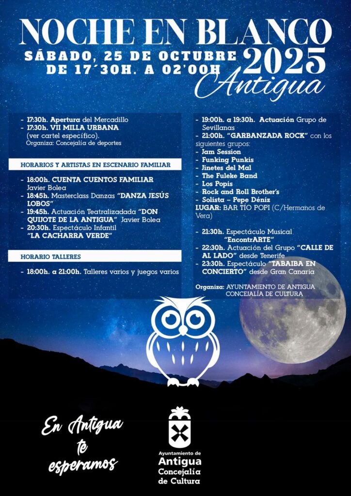 Noche en Blanco en Antigua este sábado puro espectáculo cultural, musical y creativo • La Plaza de Antigua desde las 18:00 horas ofrece espectáculos infantiles, mercadillo de variedades de comercios y colectivos, cuenta cuentos, talles, juegos, espectáculos musicales con EncontrArte y los conciertos de los grupos Calle de al lado y Tabaiba. • Una plaza […]