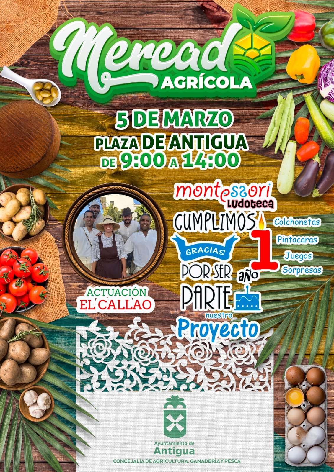 En esta ocasión, la Parranda El Callao animará musicalmente la jornada matutina del Mercado Agrícola de Antigua, en el que este 5 de marzo, la ludoteca Montessori celebra también su primer aniversario, ofreciendo un área de juegos, talleres y pintacaras para disfrute de los más pequeños con colchonetas e hinchables donde disfrutar mientras los mayores compran la cesta fresca y de calidad.