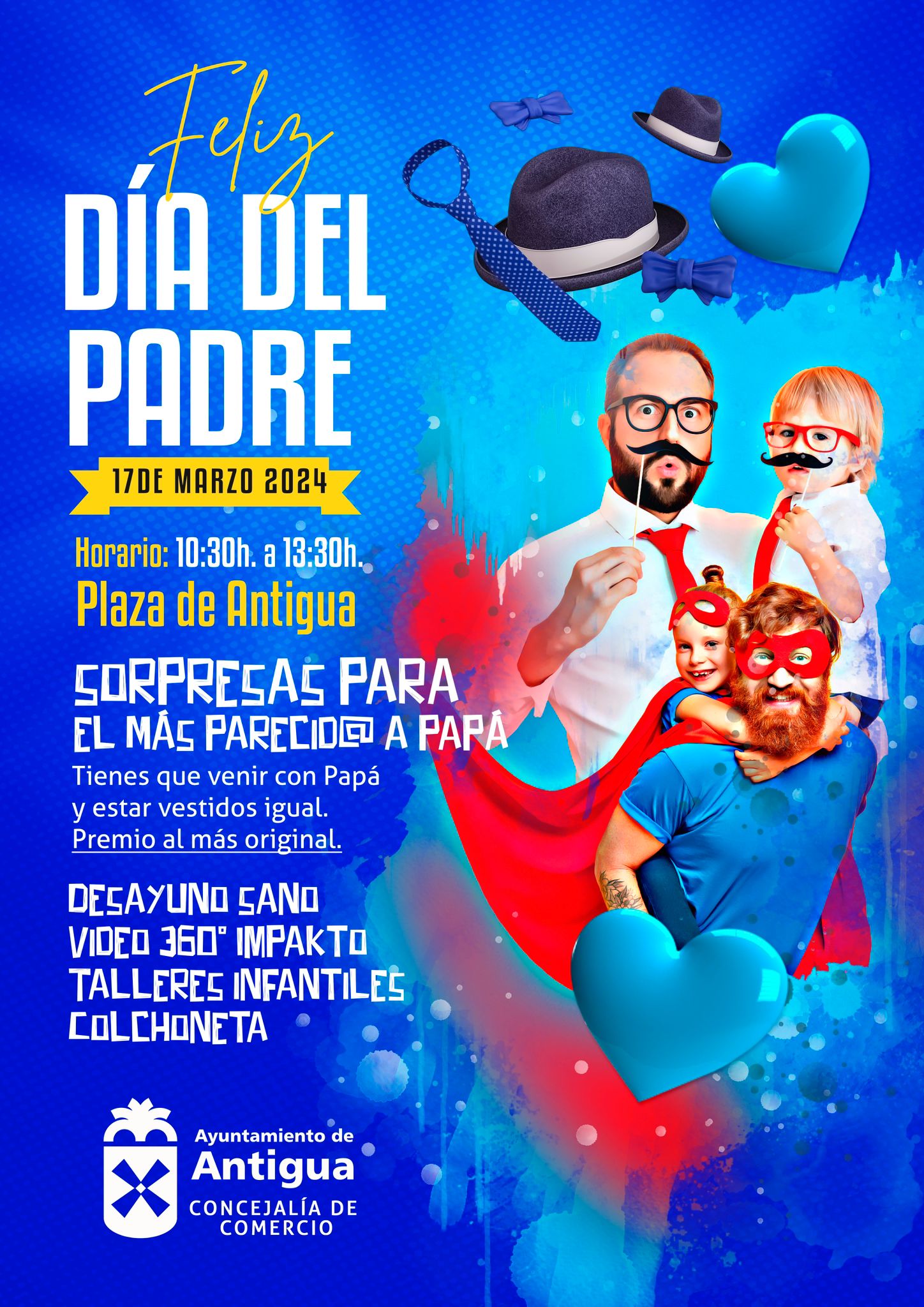 • El Ayuntamiento de Antigua desde la concejalía de Comercio organiza el domingo 17 de marzo de 10:30 a 13:30 horas, una Jornada Festiva en la Plaza de Antigua con música, sorteos, hinchables infantiles y numerosas sorpresas para celebrar el Día del Padre.