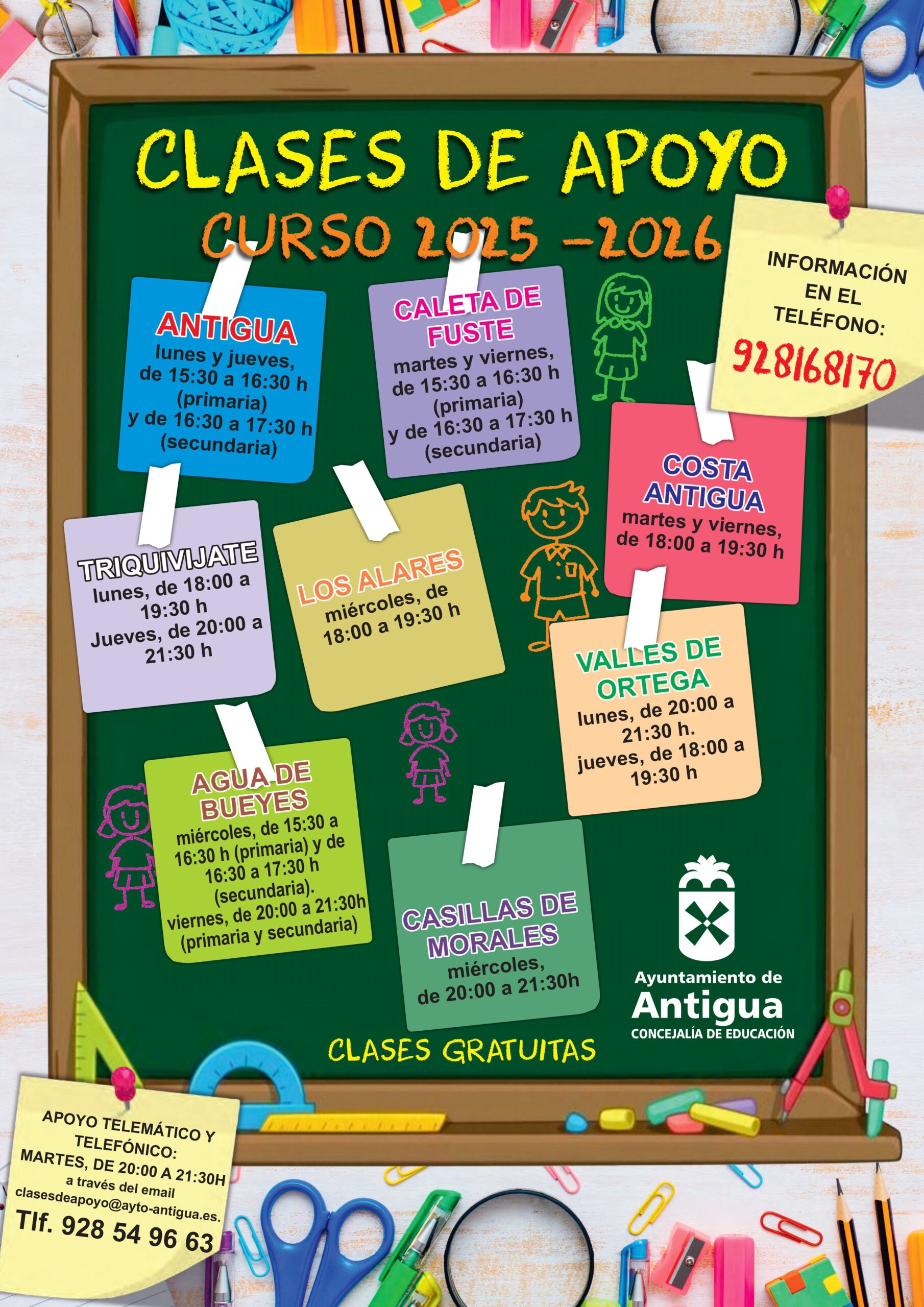 • Las Clases de Apoyo presenciales se complementan con asesoramiento y respaldo telemático y telefónico los martes de 20:00 a 21:00 horas en el 928549663 y el email clasesdeapoyo@ayto-antigua.es