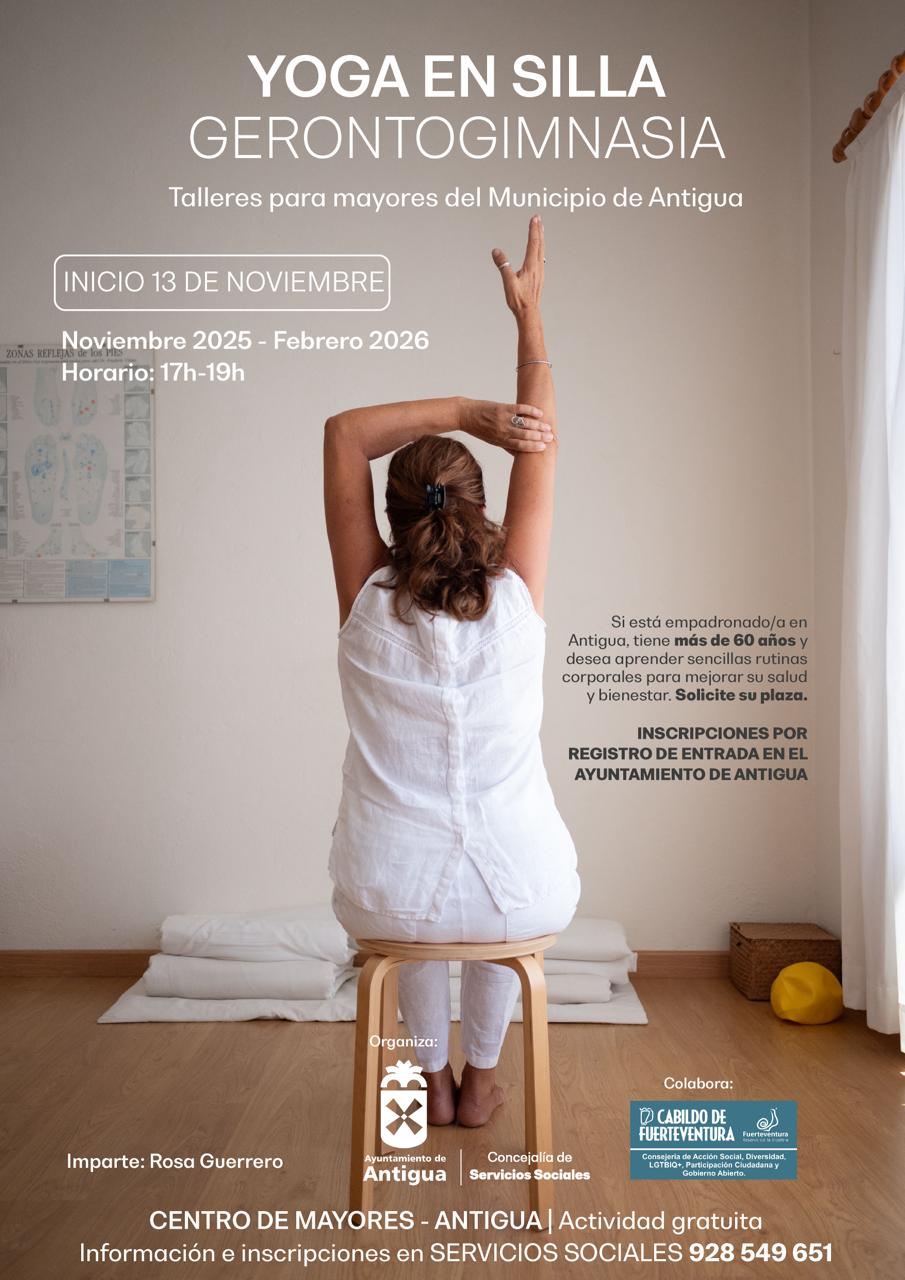El Taller de Yoga en Silla se dirige preferentemente a personas empadronadas en el Municipio de Antigua, mayores de 60 años, y esta organizado por el Ayuntamiento de Antigua desde la concejalía de Servicios Sociales con la colaboración del Cabildo de Fuerteventura.
