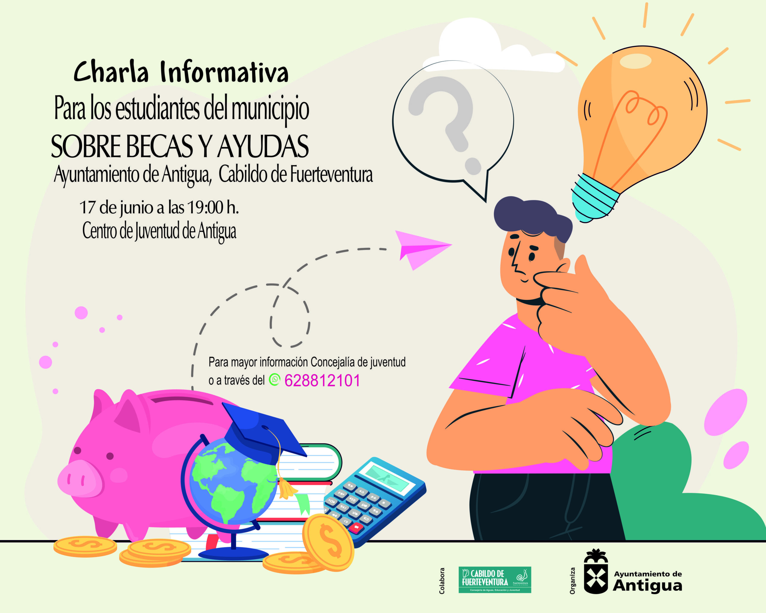 El Ayuntamiento de Antigua desde la concejalía de Juventud organiza una charla informativa sobre becas y ayudas que disponen los jóvenes en la isla y en el municipio, con tal fin, explica el alcalde, Matías Peña, invitamos a participar al consejero de Educación y Juventud, Adargoma Hernández y técnicos insulares y municipales de las áreas competentes.