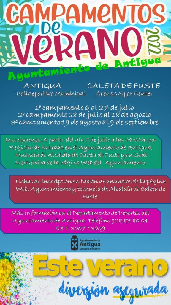 Deportes organiza seis Campamentos de Verano en Antigua y Caleta de Fuste • Deportes de Antigua aumenta hasta 45 las plazas de cada uno de los Campamentos de Verano en ambas localidades. • Abierta inscripción por Registro de Entrada en el Ayuntamiento de Antigua, Tenencia de Alcaldía en Caleta de Fuste o sede electrónica en […]