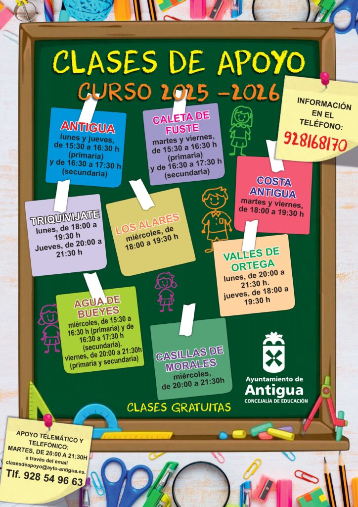Antigua organiza la nueva temporada de Clases de Apoyo en ocho localidades del Municipio • El Ayuntamiento de Antigua planifica la nueva temporada de Clases de Apoyo, ampliando a ocho las localidades del Municipio donde se imparten. • La inscripción es gratuita y comienza desde el 9 de septiembre por Registro de Entrada. • Clases […]