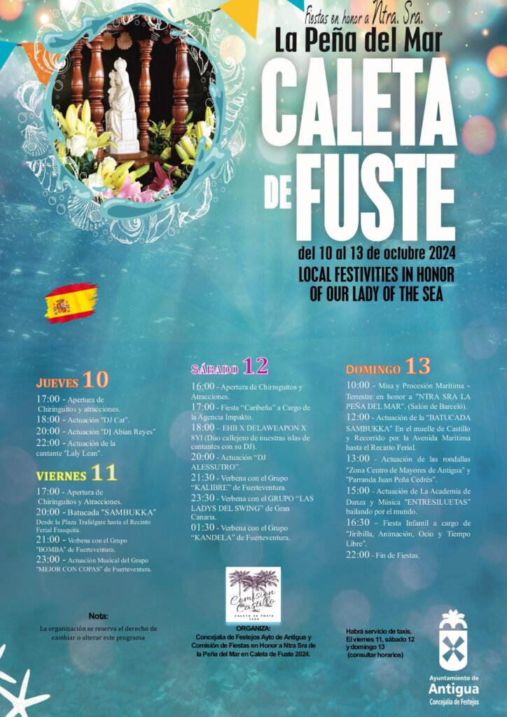 Fiestas de Caleta de Fuste en Honor a Nuestra Señora La Peña del Mar • Conciertos, Batucada y Verbena hasta el domingo 13 de octubre, Día Principal en la que se celebra la Procesión marítima terrestre en Honor a Nuestra Señora La Peña del Mar.