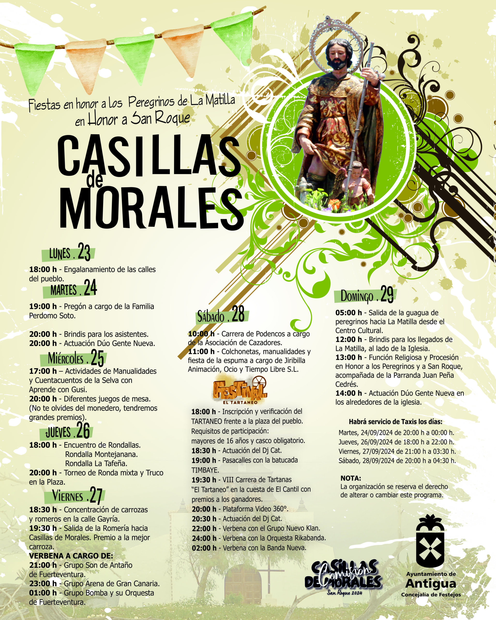 Hasta el domingo 29, el Ayuntamiento de Antigua desde la concejalía de Festejos y la Comisión de Fiestas de Casillas de Morales San Roque, anuncia el alcalde, Matías Peña García, presentan un divertido, musical y familiar programa de conciertos, verbenas, fiestas infantiles, la apasionada e imaginativa Carrera de Tartanas, o la tradicional romería el viernes tarde o la histórica Procesión de los Peregrinos de La Matilla en Honor a San Roque, pidiendo agua y salud para todos los vecinos y vecinas.