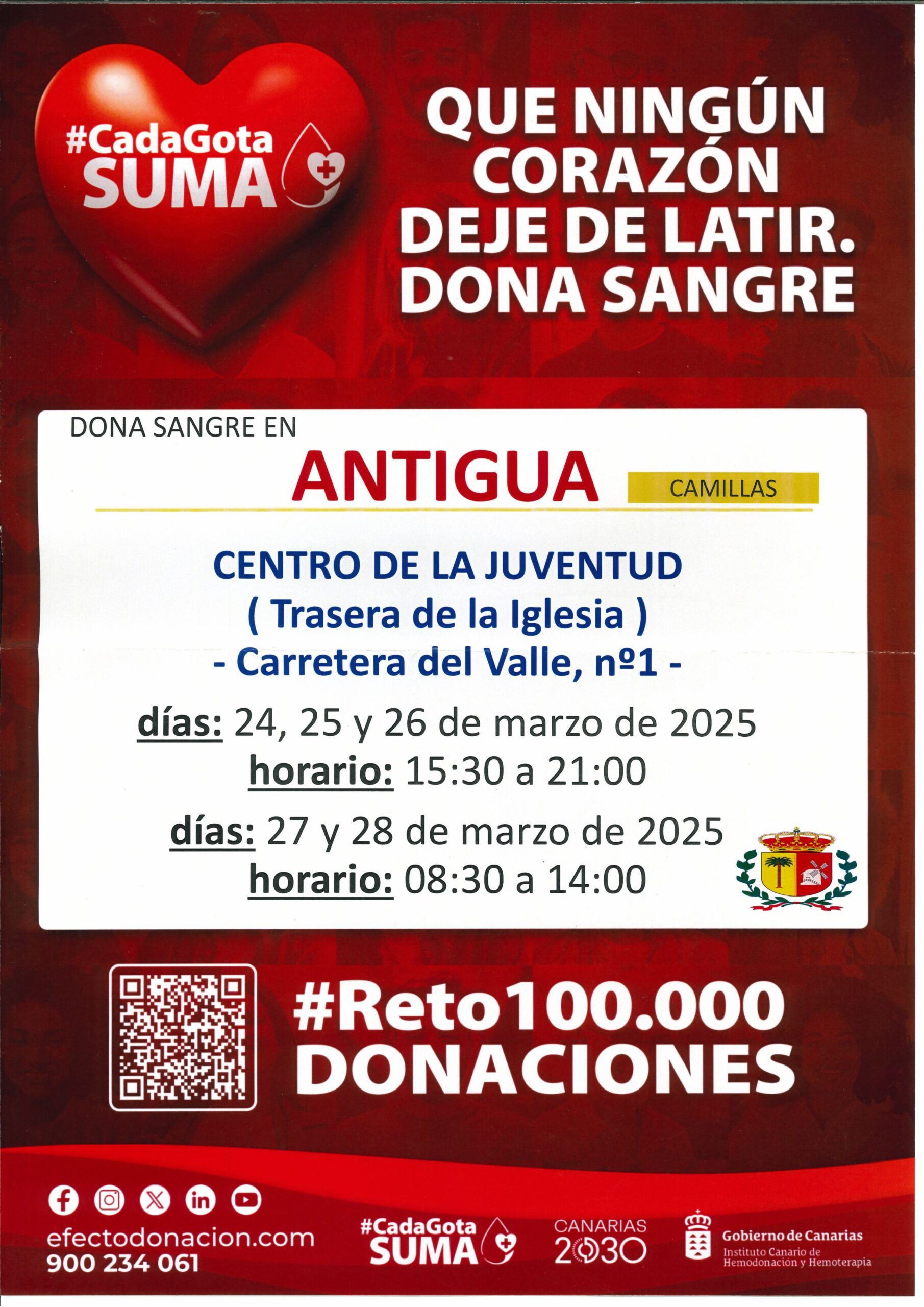 La Unidad Móvil de Donación de Sangre estará desde este lunes y hasta el miércoles 26 de marzo en horario de tarde de 15:30 a 21:00 horas junto al Centro de Juventud de Antigua, y en el mismo lugar pero en horario matutino, este jueves y viernes de 08:30 a 14:00 horas.