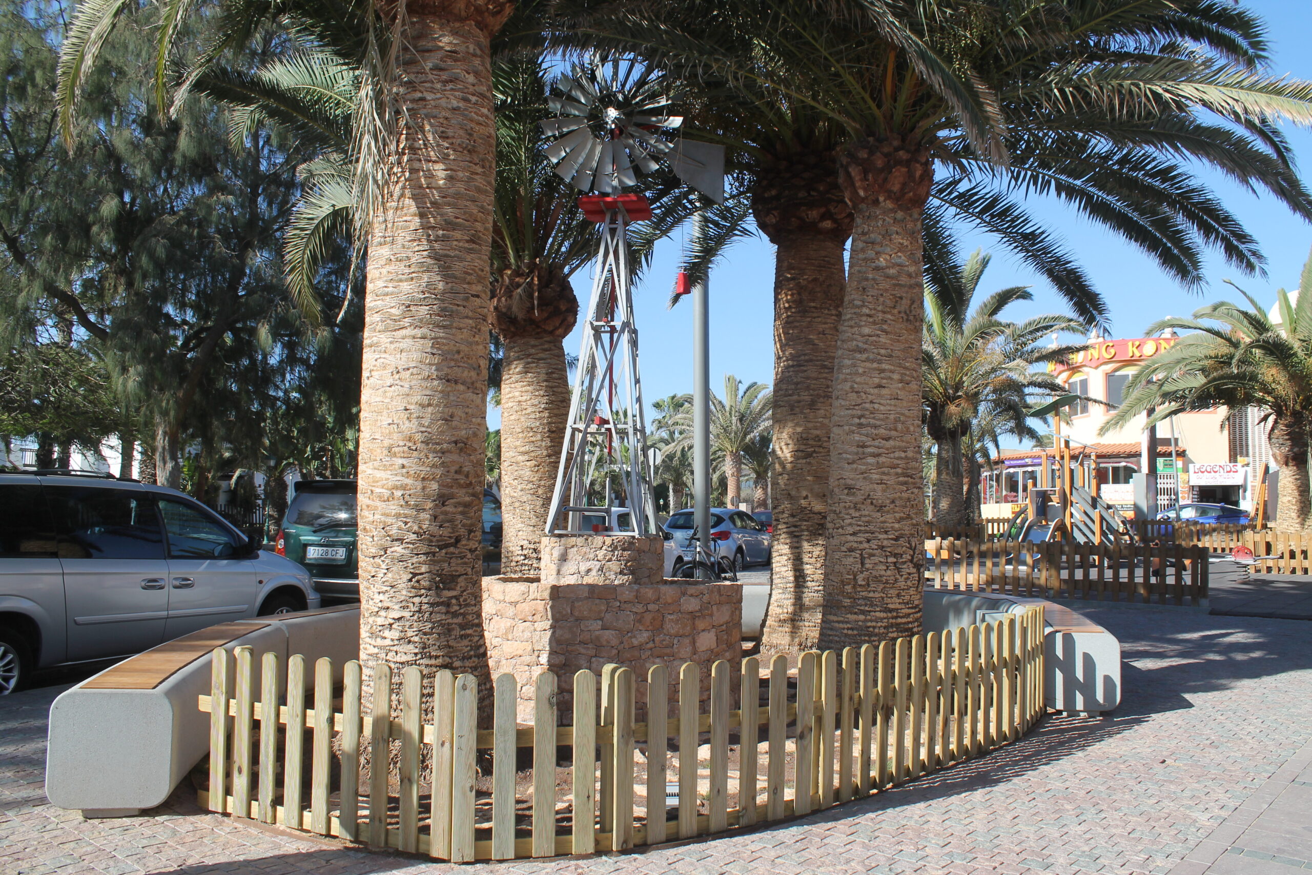 Una imagen refrescante y recuperada, que enlaza la localidad turística de Caleta de Fuste con el interior rural y de cultivo del resto del Municipio de Antigua, afirma el alcalde, Matías Peña García, un Molino Chicago en homenaje a tiempos pasados en la que su introducción en la isla e instalación en gavias y terrenos facilitó la extracción del agua de los pozos, facilitando el riego y mantenimiento de los cultivos.