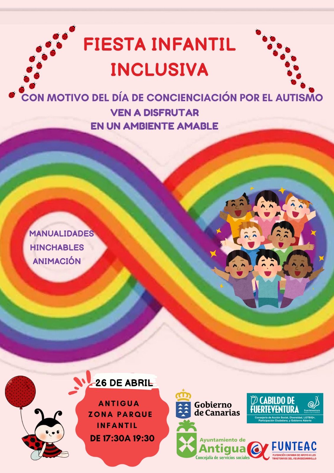 La Fiesta Infantil Inclusiva se celebra este viernes 26 de abril de 17:30 a 19:30 horas, junto al Parque Infantil de Antigua, en conmemoración del Día Mundial de Concienciación por el Autismo, donde las familias con pequeños y pequeñas afectadas por cualquier trastorno del neurodesarrollo, serán especialmente acogidas y atendidas como requiera cada menor para disfrutar de Talleres de Manualidades, Hinchables y divertida Animación, añade la concejala de Servicios Sociales.
