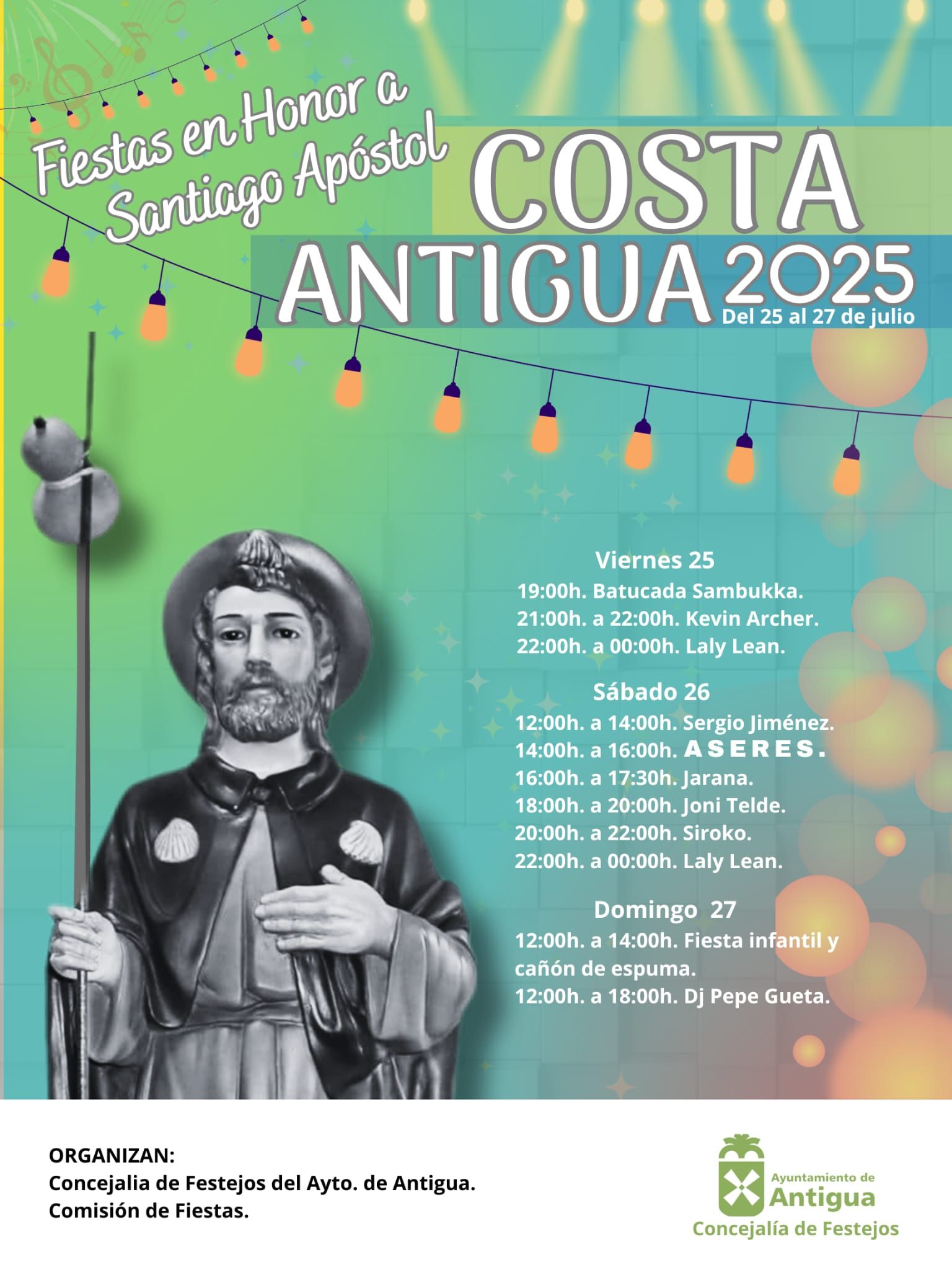 El Ayuntamiento de Antigua desde la concejalía de Festejos avisa del comienzo de las Fiestas de Costa de Antigua desde este viernes 25 de julio a las 19:00 horas, despertando las calles al ritmo de la percusión de la Batucada Sambukka, anunciando un programa, hasta el domingo 27 por la tarde, de actuaciones musicales, conciertos y refrescante fiesta infantil.