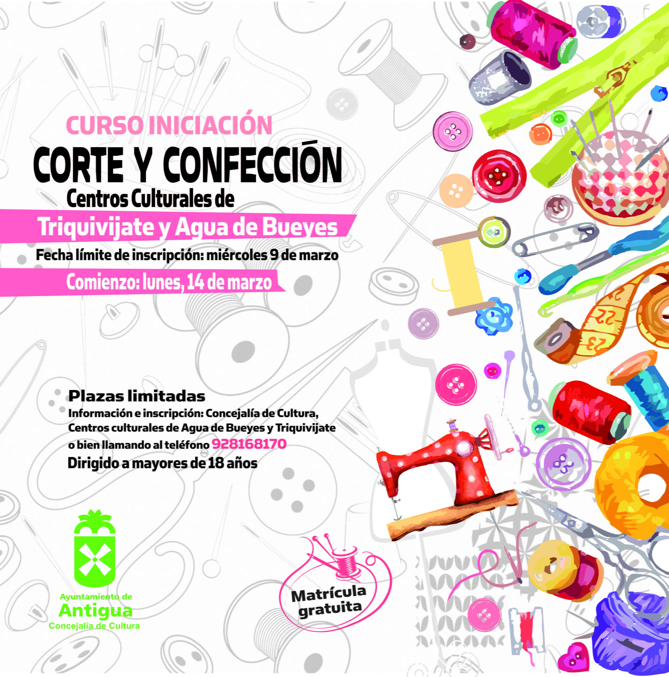 El Ayuntamiento de Antigua desde la concejalía de Cultura organiza un Curso de Iniciación de Corte y Confección de matrícula gratuita y dirigido tanto a hombres como mujeres mayores de 18 años, preferentemente empadronados en el Municipio.