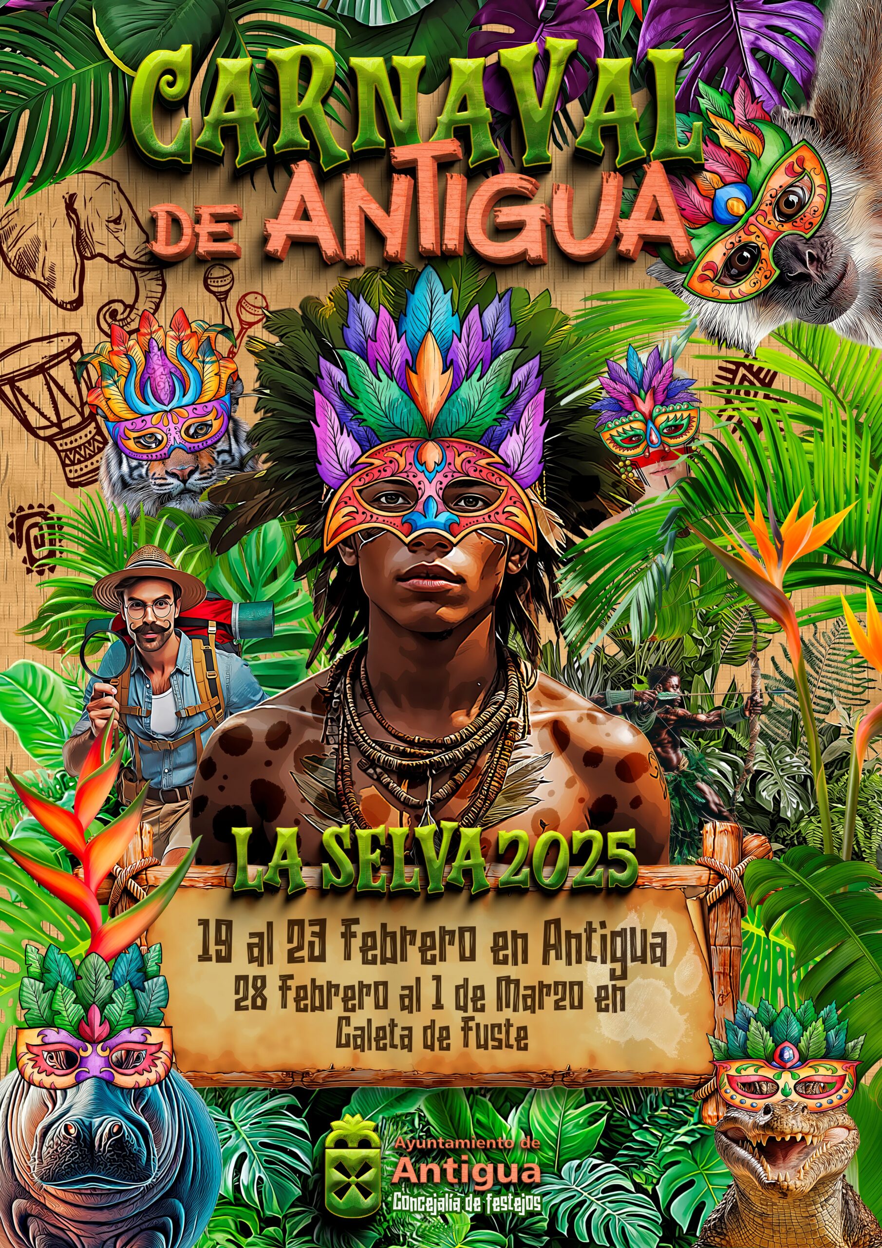 Es tiempo de fiestas carnestolendas donde todo es posible y la imaginación no tiene límites en esta selva extendida por las calles y plazas de Antigua y Caleta de Fuste, donde no faltará un coso carnavalero a ritmo de percusión, ni una provocativa Gala Drag, o una Gala glamurosa llena de luces y preciosos diseños para decidir Reina Infantil del Carnaval 2025, ni faltarán, añade el concejal Armas Martín, conciertos, espectáculos y tributos musicales para todos los gustos y edades.