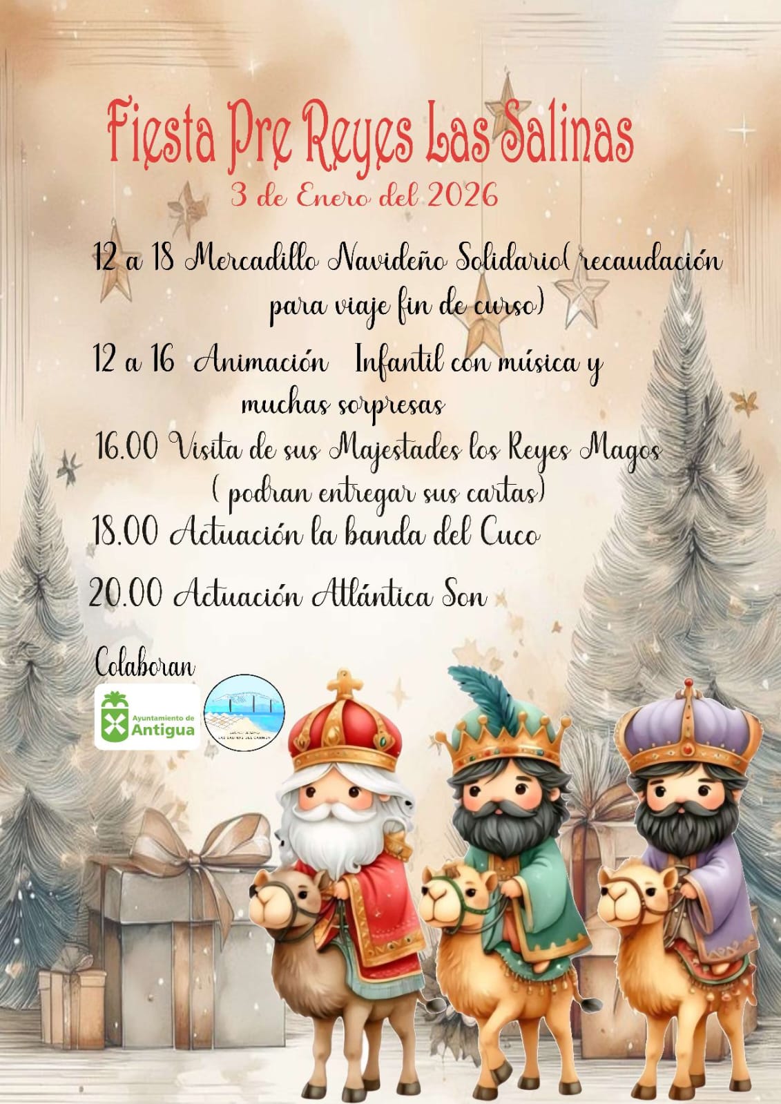 La Fiesta Pre-Reyes Las Salinas arranca con la apertura del Mercadillo Navideño Solidario, detalla el concejal de Festejos, Pedro M. Armas, que se complementará de 12:00 a 16:00 horas con animación infantil para recibir a su término a Reyes las Salinas y seguidamente las actuaciones a las 18:00 horas de La Banda del Cuco y Atlántica Son a las 20:00 horas.