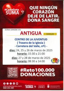Dona Sangre en Antigua • Antigua acoge hasta este viernes 28 la unidad de móvil de Hemodonación del ICHH. • Este lunes 24, martes 25 y miércoles 26 de marzo de 15:30