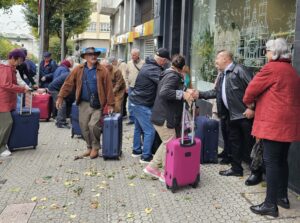 Un viaje de aventuras para los 85 mayores de Antigua que recorren Galicia • El alcalde de Antigua sorprende en pleno viaje a los mayores en su viaje. • Con paraguas y