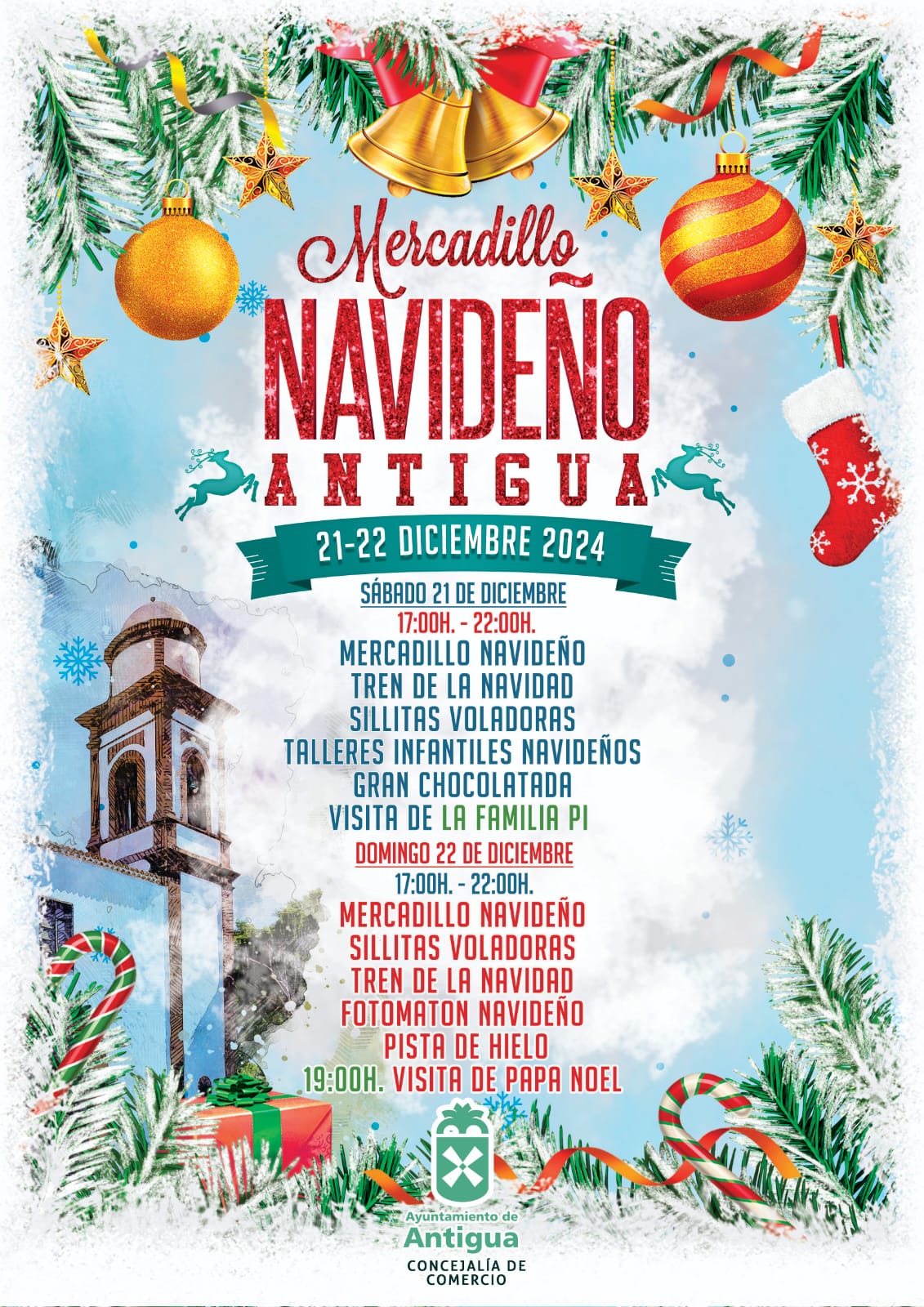 • El Mercadillo Navideño este sábado y domingo de 17:00 a 22:00 horas en la plaza de Antigua invita a disfrutar del Tren de Navidad, Sillitas Voladoras y numerosas sorpresas para toda la familia.