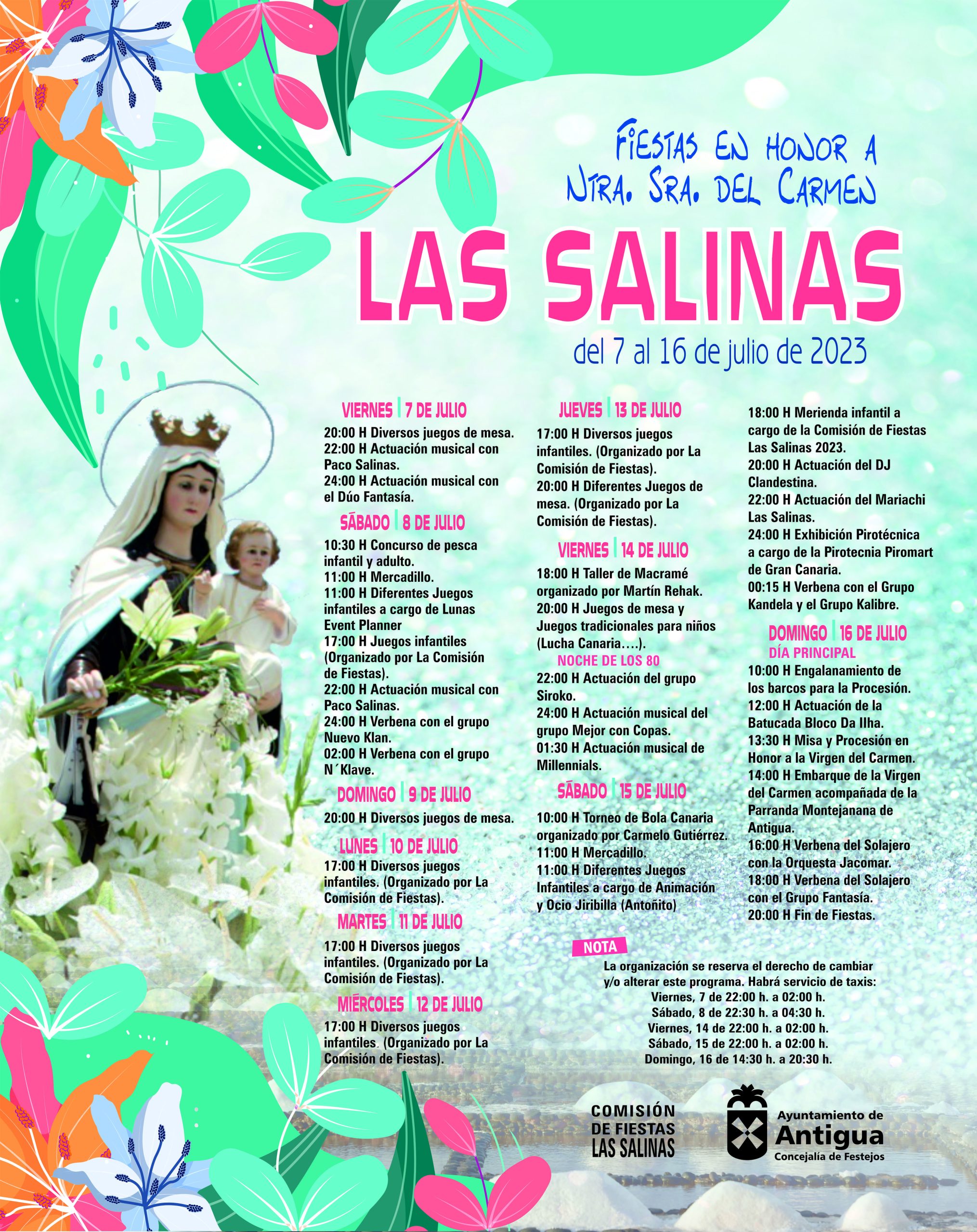 Las Fiestas de Las Salinas finalizan con el Día Grande este domingo 16 de julio que comienza con el ritmo de la batucada Bloco Da Ilha, desde las 12:00 horas para proceder a las 13:30 horas con la misa y procesión en Honor a Nuestra del Carmen en tierra sobre los hombros de las mujeres, como viene siendo tradición en estas fiestas, para embarcarla a las 14:00 horas con la marea alta.