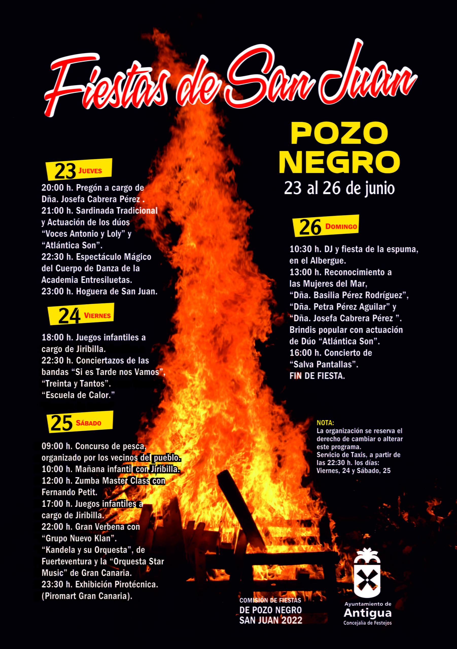 El cartel de las Fiestas de Pozo Negro ofrece un fin de semana completo de pop, rock, verbena de orquestas, exhibición pirotécnica, fiestas del agua y concurso de pesca infantil, y añade el concejal, si el jueves disfrutamos de la sardinada tradicional y las actuaciones de los dúos de Antonio y Loly y Atlántica Son, el viernes por la tarde, juegos infantiles con Jiribilla y los conciertazos de la Bandas Si es Tarde nos Vamos, Treinta y Tantos y Escuela de Calor.