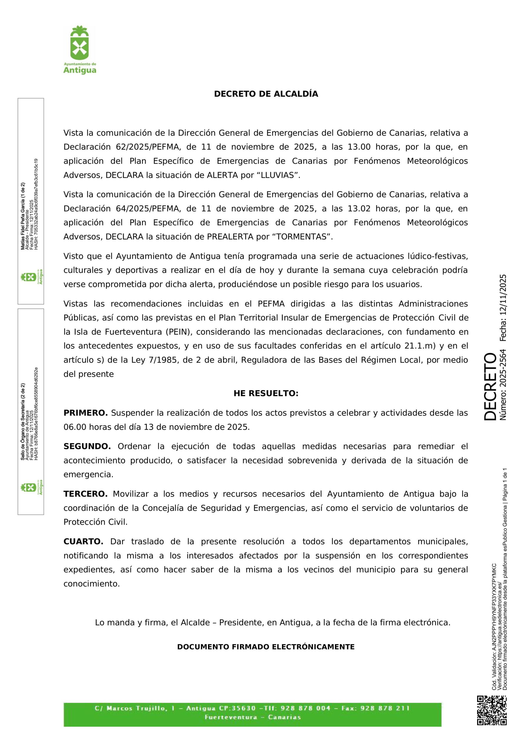 Ante las alertas meteorológicas previstas en Fuerteventura este jueves 13 de noviembre desde las 06:00 horas y cumpliendo con las recomendaciones de la Dirección General de Emergencias del Gobierno de Canarias, el Ayuntamiento de Antigua suspende todas las actividades organizadas hasta nuevo aviso.