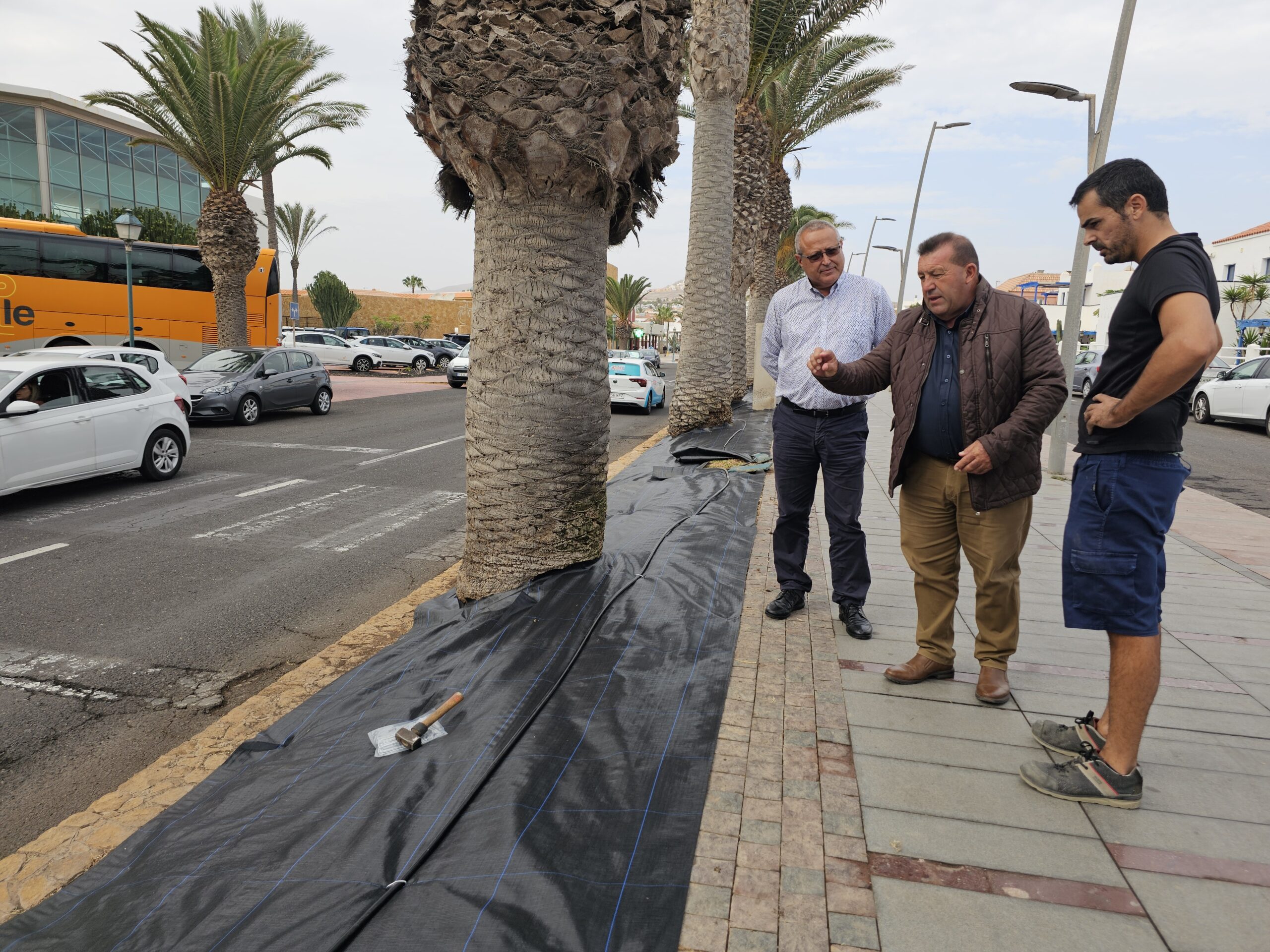 El alcalde de Antigua, Matías Peña García y el concejal de Obras, Servicios, Parques y Jardines, Juan Cabrera visitan la actuación de embellecimiento que se desarrolla en la mediana en Caleta de Fuste emplazada entre dos avenidas principales, Castillo y Alcalde Juan Évora Suárez.